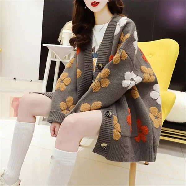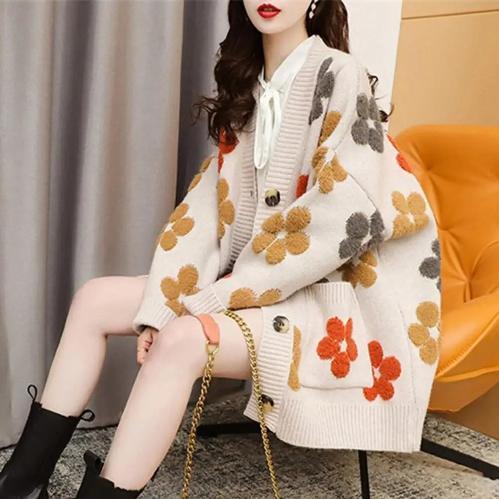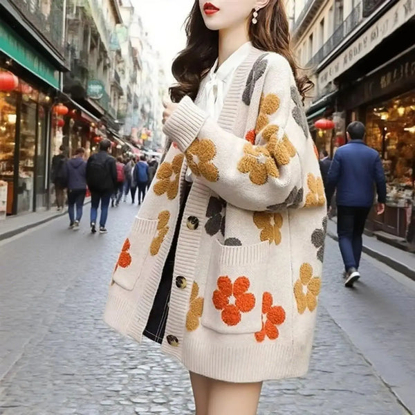 2025 Autumn New Women Sweater Coat V-Neck Long Sleeve Flower Pattern Knitted Cardigan Loose Fit Autumn Winter Knitting Coat