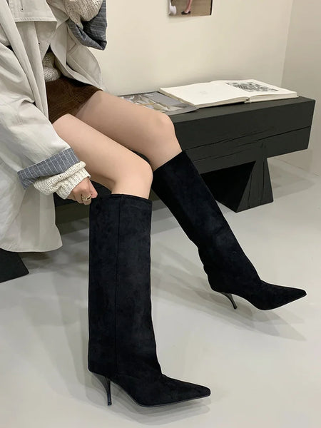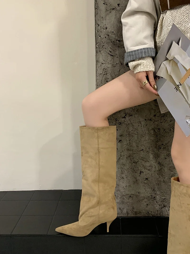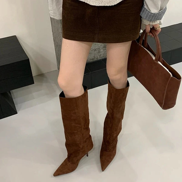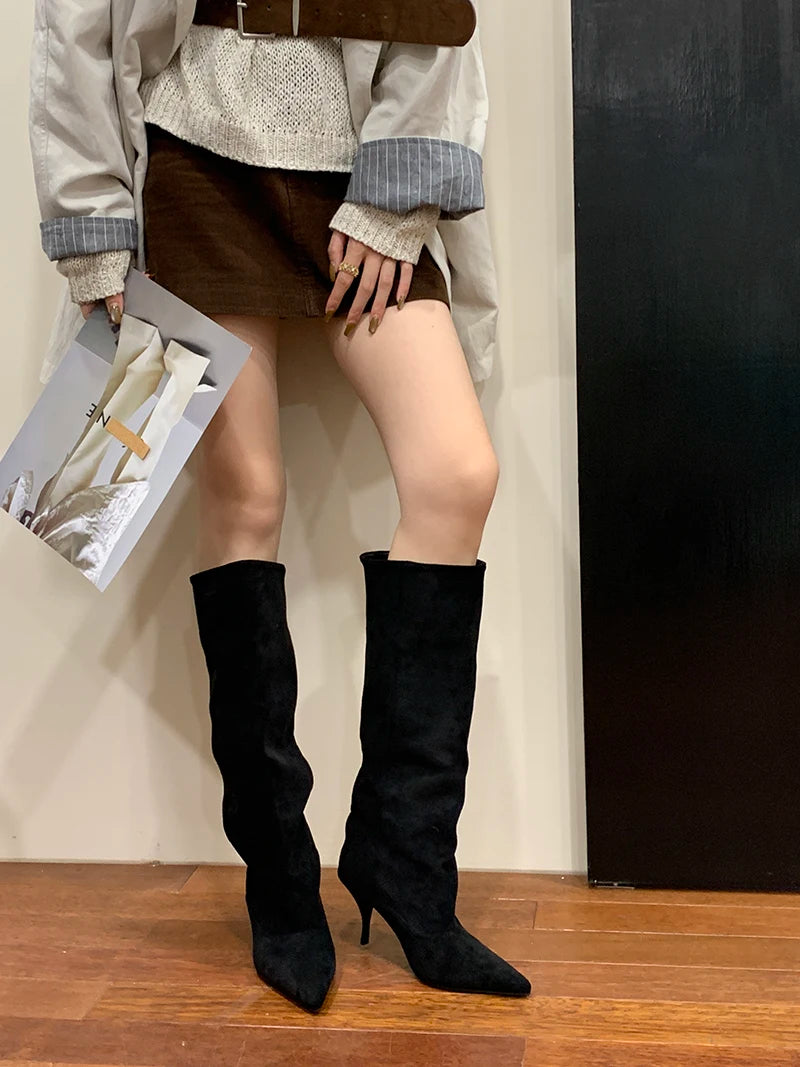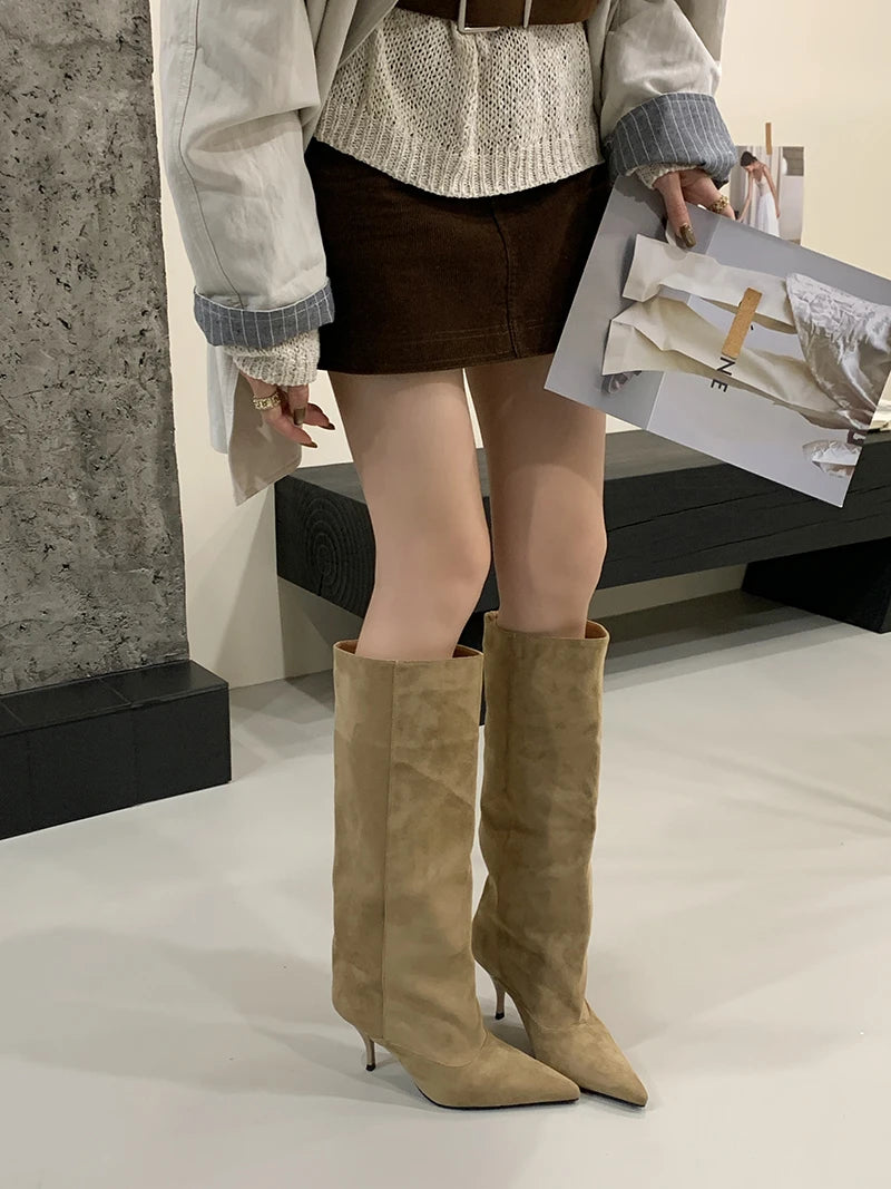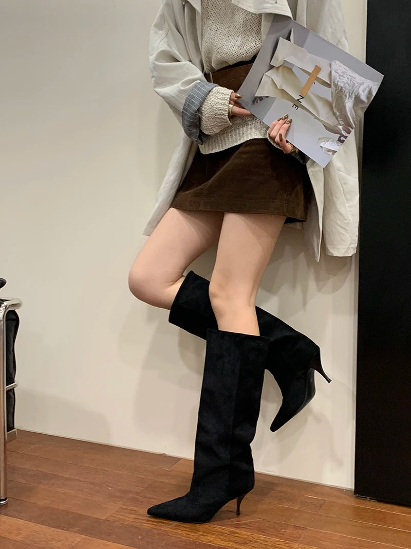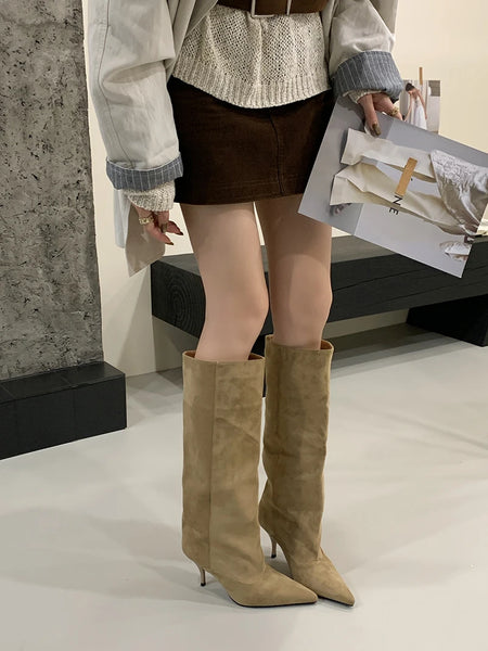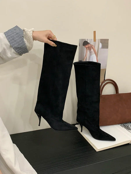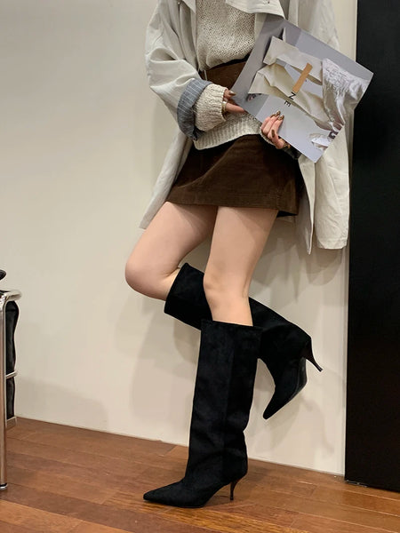 Aneikeh Autumn Winter Fashion Long Booties Shoes Thin Heels Concise Pointed Toe Pleated Knee-High Boots Women Zapatos De Mujer