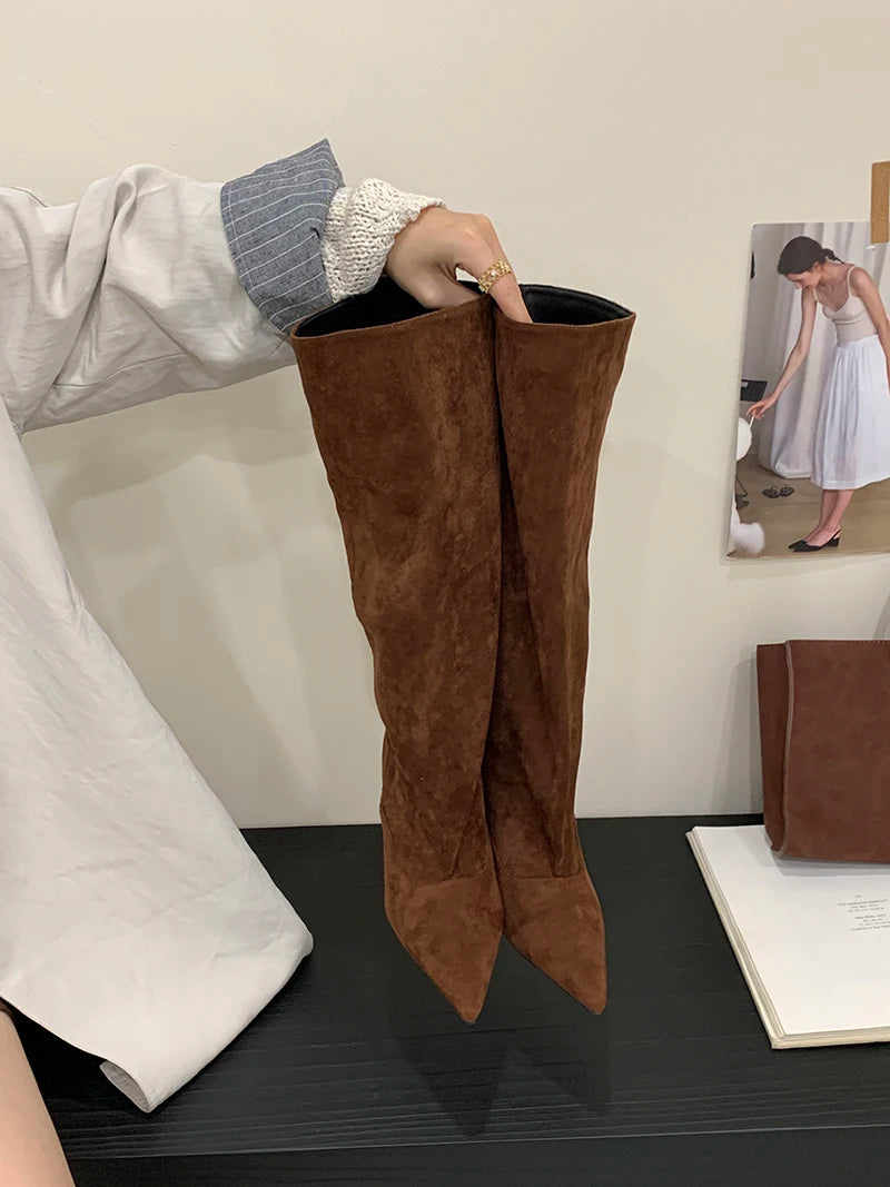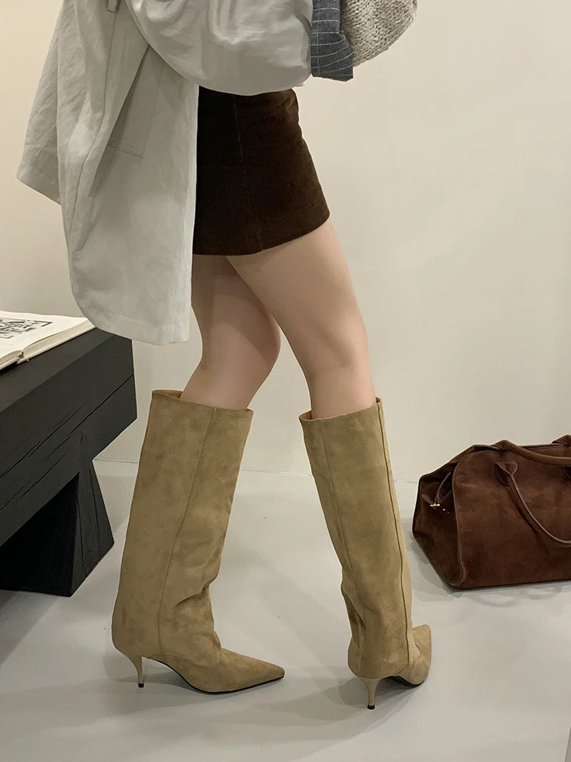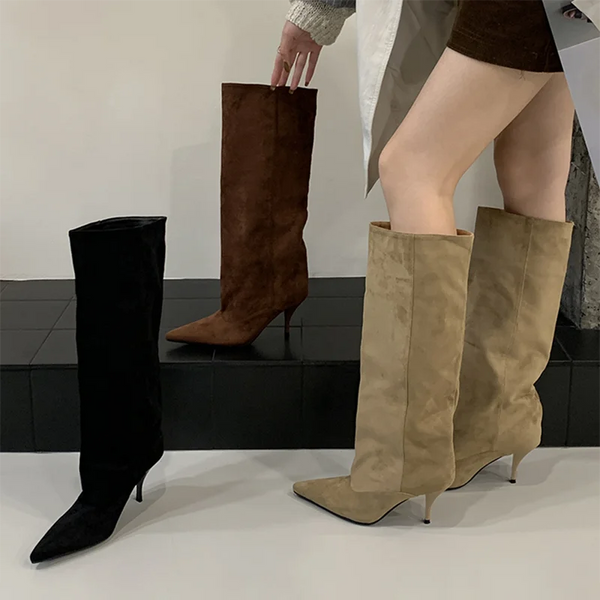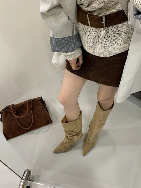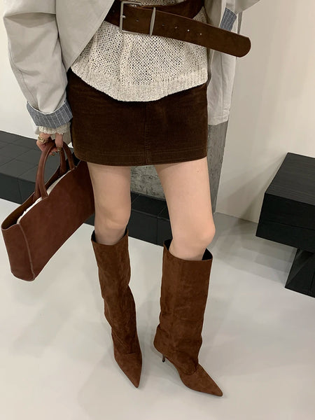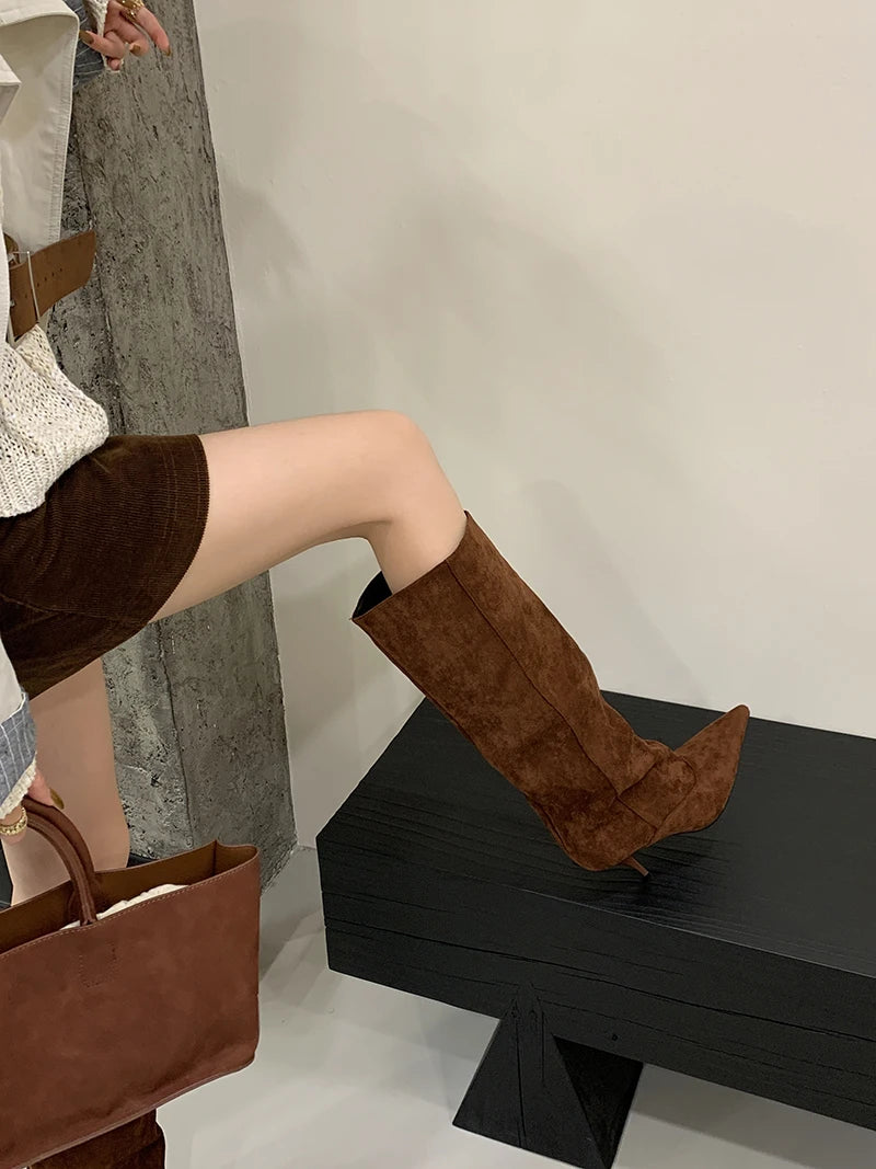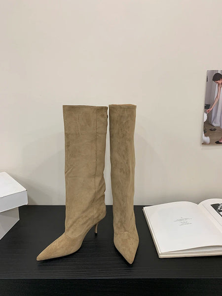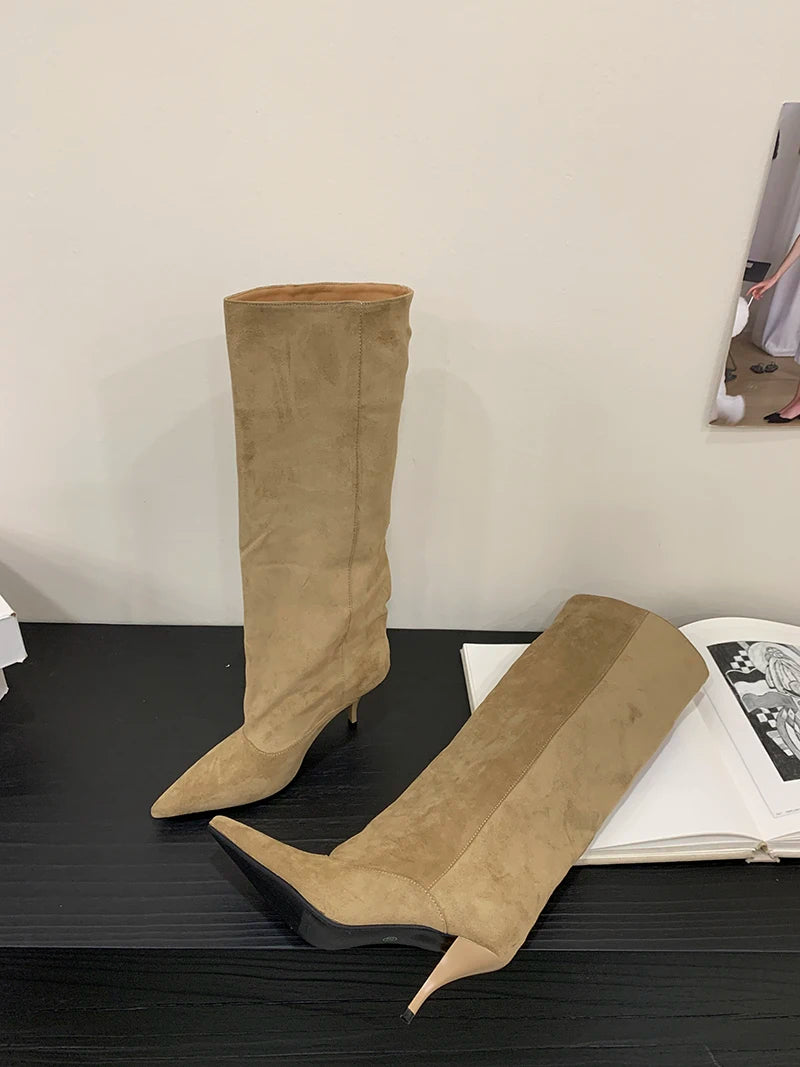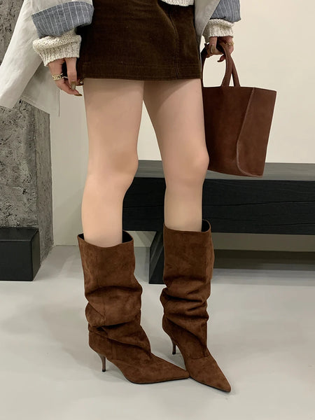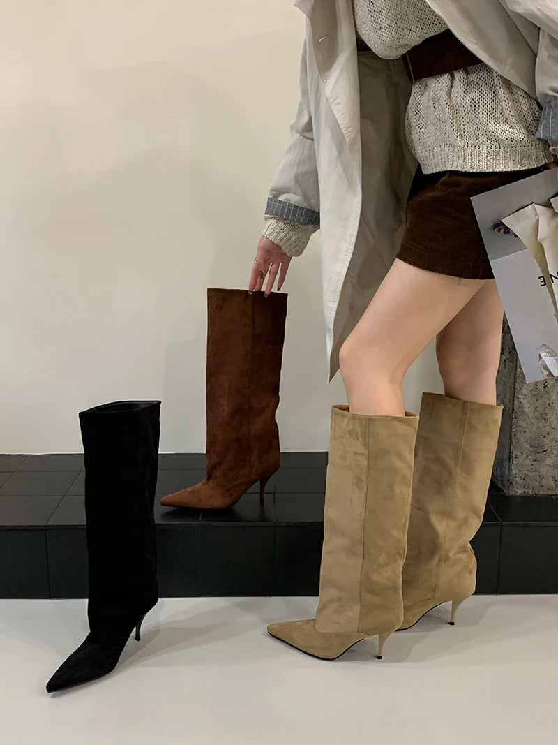 Aneikeh Autumn Winter Fashion Long Booties Shoes Thin Heels Concise Pointed Toe Pleated Knee-High Boots Women Zapatos De Mujer