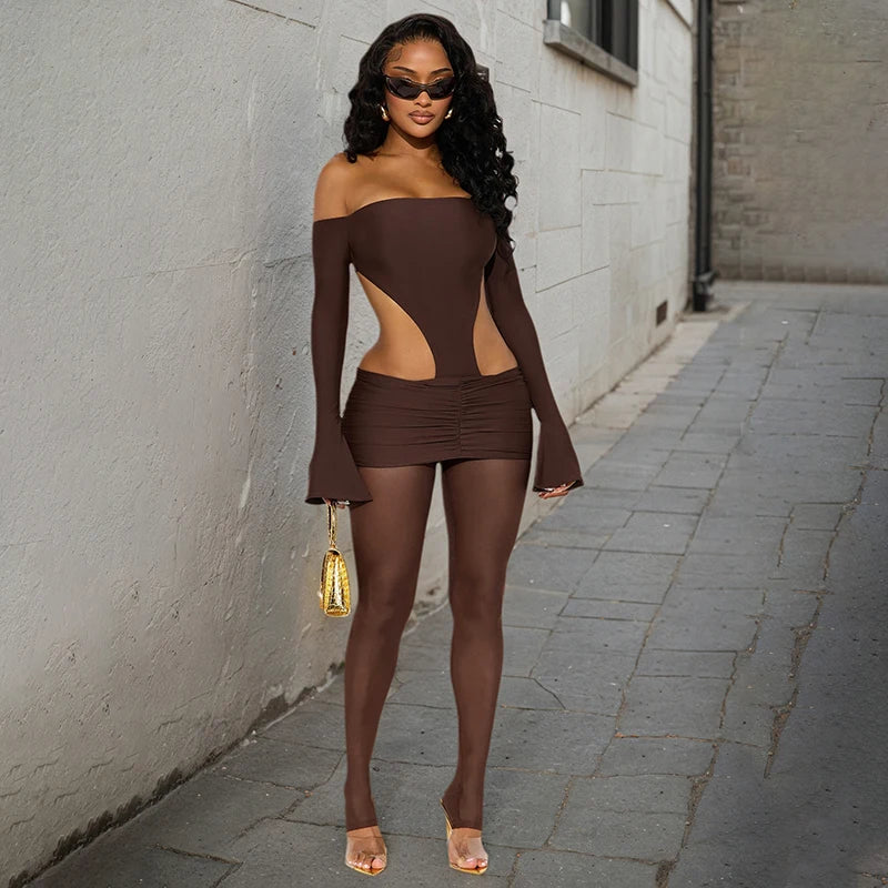 CUTENOVA Women Fall New Arrival Sexy Off-Shoulder Backless Long Sleeve Mesh See Through Bodycon Jumpsuit With Hollow Out Waist