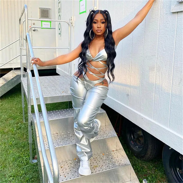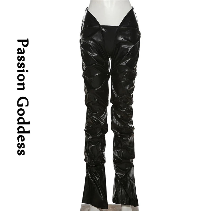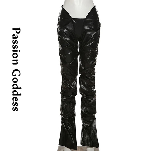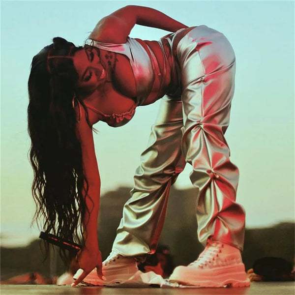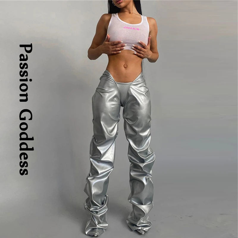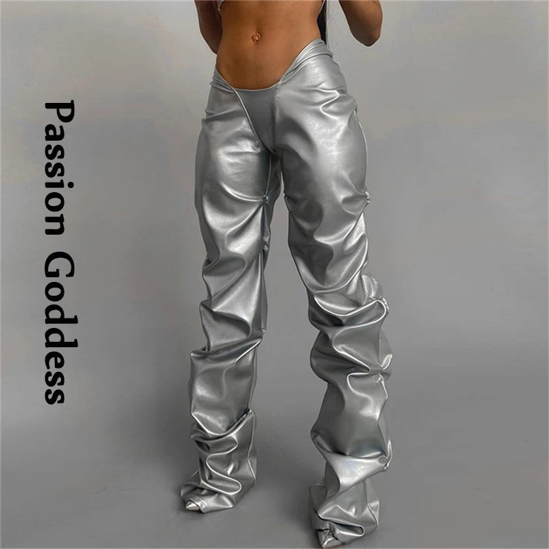 Fashion Women Metallic Silver PU Stacked Pants Pleated V Shape Low Waist Straight Pants Shiny Leather Elastic Stacked Trousers